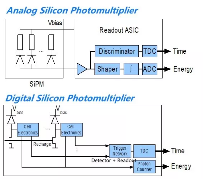 從其名字就可以看出,其功能和原理依然沒有脫離傳統(tǒng)光電倍增管的范疇,最多只能算半數(shù)字化探測器。其最早用于倒車?yán)走_(dá)、質(zhì)譜儀等信號采集原件,在PET/CT的應(yīng)用最早在2004年左右(5,6)。