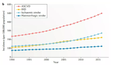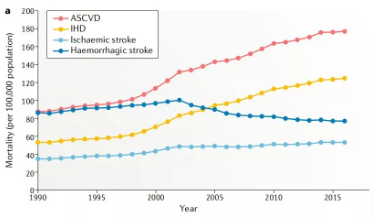 腦卒中、冠心病等心血管疾病(Cardiovascular disease,CVD)是造成我國居民死亡和疾病負擔的首要病因,占中國死亡人口的40%,CVD發(fā)病率呈現(xiàn)逐年快速攀升的趨勢,目前我國CVD患者超過 2.9 億例。動脈硬化性心血管疾?。ˋtherosclerotic cardiovascular disease,ASCVD)是一種單一類型的心血管疾病,包括缺血性卒中(Ischaemic stroke)和缺血性心臟?。↖schaemic heart disease,IHD)。從1990年至2016年,ASCVD的死亡人口增加近100萬,據(jù)統(tǒng)計2016年約有240萬人死于ASCVD,占CVD總死亡人口的61%,占所有死亡的25%。