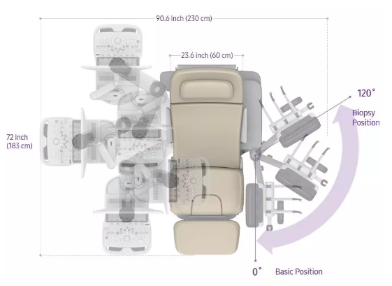 Hera i 10明顯區(qū)別于其他同類設(shè)備的亮點(diǎn)是安裝于顯示器右側(cè)的可調(diào)節(jié)座椅,最大尺寸長度為7.5英尺(230厘米)x寬6英尺(183厘米)x高度5.7英尺(175厘米)。座椅可通過機(jī)械控制,自動調(diào)整角度來配合醫(yī)生檢查和優(yōu)化患者就診體驗(yàn)。