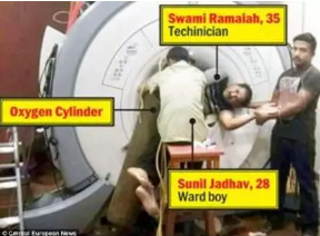 2014年11月8日,印度新孟買的塔塔紀(jì)念醫(yī)院發(fā)生了一起罕見的磁共振事故,當(dāng)時,一名男性患者被推入醫(yī)院接受磁共振檢查。在掃描過程中,主治醫(yī)生讓28歲的護(hù)工Sunil Jadhav去取一個氧氣面罩。Jadhav從來沒有在MRI檢查室工作過,也不知道MRI附近不允許有任何金屬,他以為醫(yī)生是讓自己去取一個氧氣瓶。