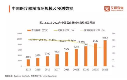 艾媒咨詢數(shù)據(jù)顯示,中國醫(yī)療器械整體市場規(guī)模已由2014年的2556億元增長至2018年的5304億元,年均增速保持在20%左右,營業(yè)收入及凈利潤均保持高速增長態(tài)勢,屬于醫(yī)療器械行業(yè)發(fā)展黃金期,預(yù)計到2022年中國醫(yī)療器械市場規(guī)模將超過9000億元。