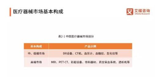 在市場結(jié)構(gòu)方面,按照不同的市場定位來劃分,中國醫(yī)療器械市場基本由中低端產(chǎn)品以及高端產(chǎn)品構(gòu)成,中低端市場包括DR設(shè)備、CT機(jī)等產(chǎn)品,高端市場包括MRI、PET-CT等產(chǎn)品。
