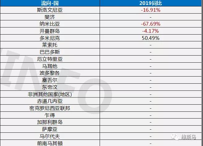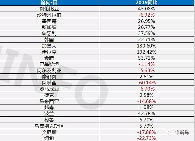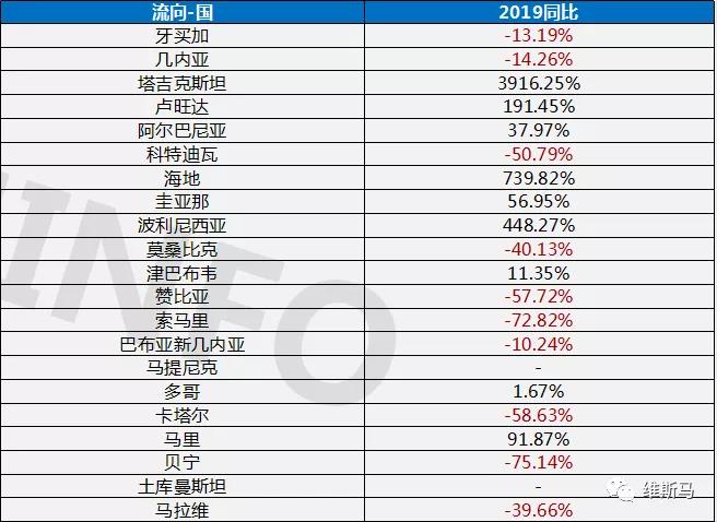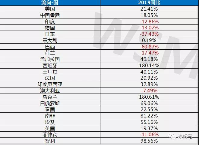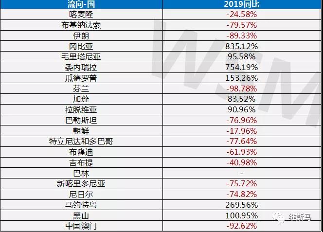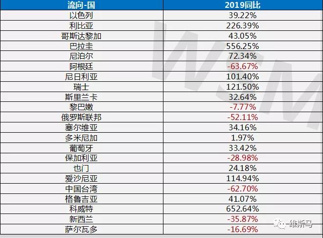 從出口流向國(guó)看,2019年同比率增長(zhǎng)的流向國(guó)共計(jì)88國(guó),2019年同比率下降的國(guó)家共有63國(guó)。