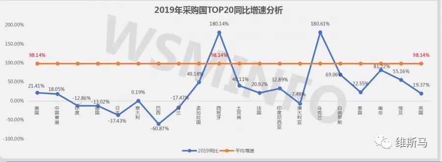2019年同比國(guó)家平均增速為98.14%。其中西班牙和烏克蘭的增速都在平均增速之上。