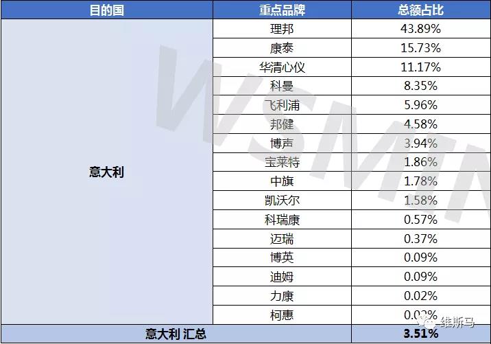 意大利市場(chǎng)為中國(guó)心電圖出口第六大市場(chǎng),共計(jì)16家出口商,占全年心電圖出口3.51%的份額。其中理邦在意大利市場(chǎng)占有率高達(dá)43.89%。