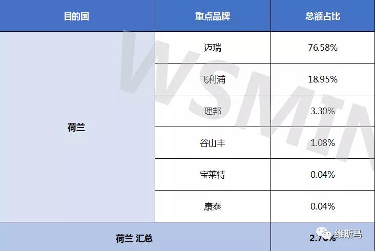 荷蘭市場(chǎng)為中國(guó)心電圖出口第七大市場(chǎng),共計(jì)6家出口商,占全年心電圖出口2.76%的份額。其中深圳邁瑞在荷蘭市場(chǎng)占有率高達(dá)76.58%。