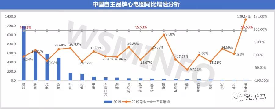 2019年中國(guó)自主品牌心電圖平均增速為95.53%,保持良好的勢(shì)頭。在心電圖TOP20中,其中瑞康宏業(yè)這個(gè)公司,增速超過(guò)自主品牌平均增速。