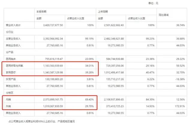 根據(jù)半年報(bào),公司產(chǎn)品主要集中在醫(yī)用呼吸與供氧、家用醫(yī)療等領(lǐng)域,這兩項(xiàng)產(chǎn)品占比超過7成,且業(yè)務(wù)主要在境內(nèi)進(jìn)行。所以真正能夠決定公司未來常態(tài)化業(yè)績表現(xiàn)的,不是外貿(mào)產(chǎn)品,也不是海外訂單。
