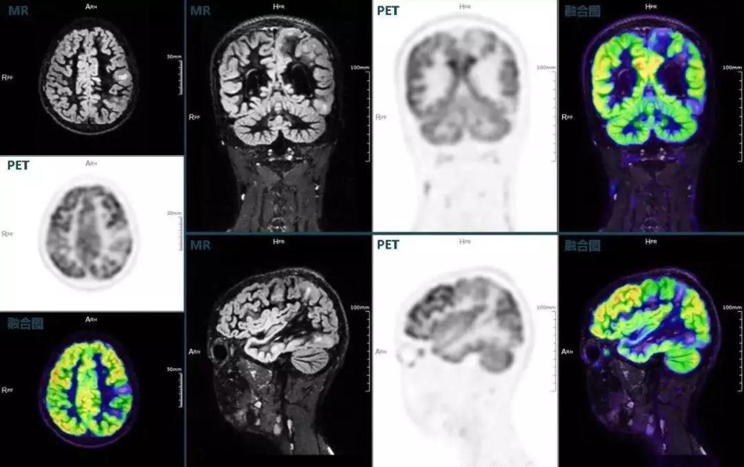 (結節(jié)性硬化,MR DIR序列清晰顯示腦皮層病理改變,PET顯示了病灶區(qū)域FDG的低濃聚。PET/MR融合顯像同時提供了結構異常改變和功能變化的信息。)