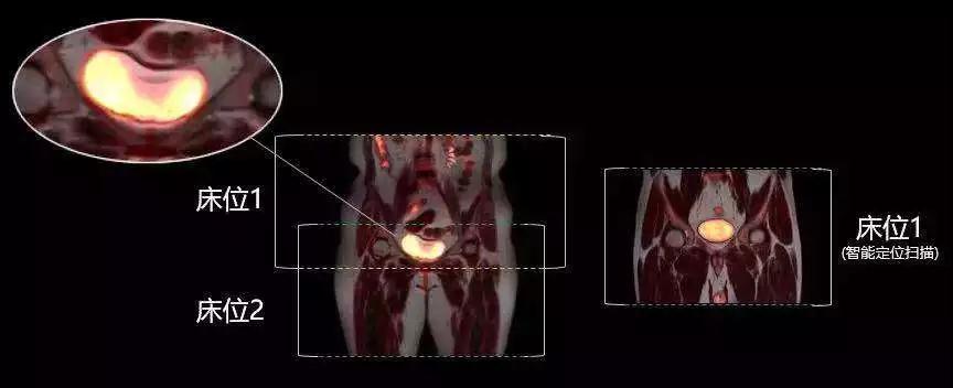 (左圖主要器官分散在兩個床位時的成像,右圖為智能定位能將床位全部置于主要器官中心時成像,避免了由于主要器官分散在兩個床位產(chǎn)生的圖像錯配,也提高了主要器官的PET/MR圖像質量。)