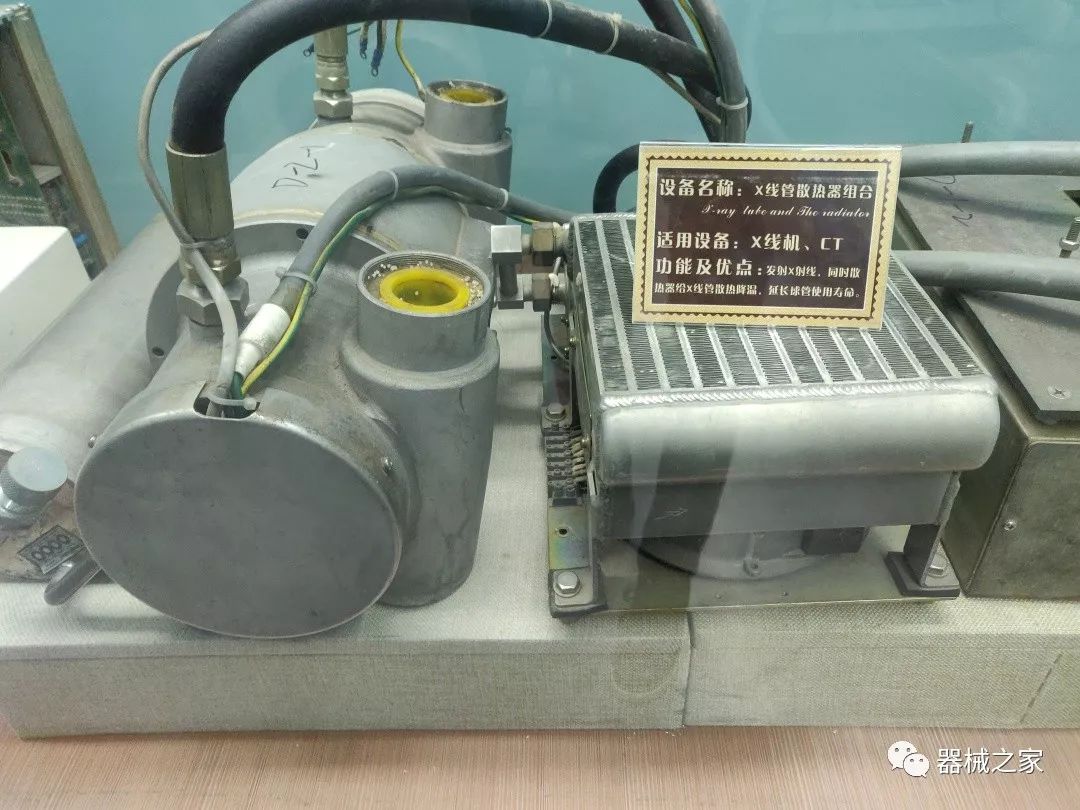 由于X線機(jī)產(chǎn)生X射線的過(guò)程中只有百分之一的動(dòng)能轉(zhuǎn)化為X射線,其余的能量都以熱能的形式散失。這就需要良好的散熱設(shè)備,也就是這個(gè)散熱器。散熱器大多采用油冷。變壓器油不僅絕緣,而且能夠吸收散亂射線,防止擊穿。使用時(shí),一般會(huì)用油泵將冷油泵入到球管周圍,將熱油從另一管導(dǎo)出,在冷卻板上冷卻,循環(huán)利用。