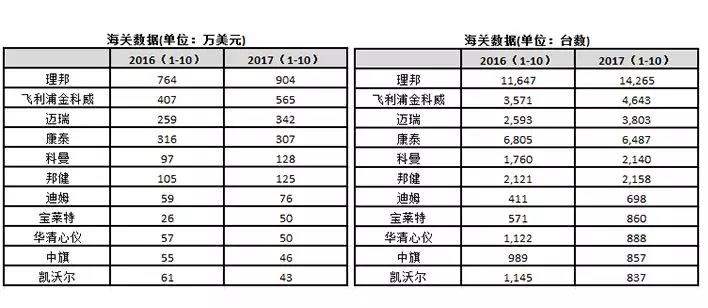 截止2017年10月國內(nèi)心電廠家出口銷量及銷售額