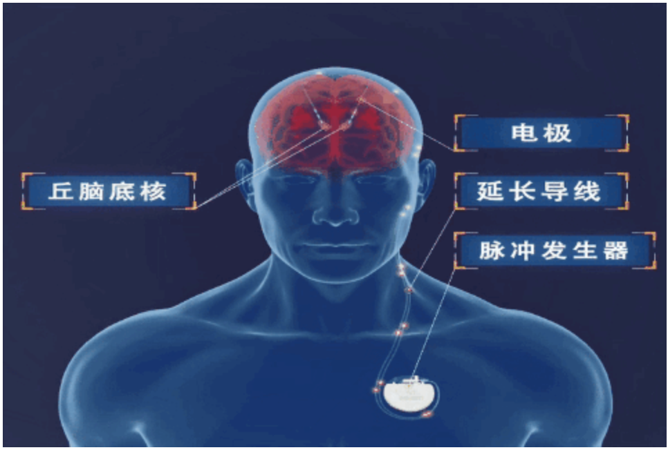 腦起搏器是腦深部電刺激療法(DBS)的俗稱,這種直接作用于神經(jīng)中樞的人工裝置,通過(guò)埋植于胸前的脈沖發(fā)生器向植入在大腦特定靶點(diǎn)的電極發(fā)放弱電脈沖,刺激腦內(nèi)控制運(yùn)動(dòng)的相關(guān)神經(jīng)核團(tuán),抑制引起帕金森病癥狀的異常腦神經(jīng)信號(hào)。從而消除因帕金森病導(dǎo)致的運(yùn)動(dòng)失能,并減輕服用藥物產(chǎn)生的運(yùn)動(dòng)癥狀波動(dòng)和異動(dòng),成為藥物“蜜月期”結(jié)束后首選的治療方法。