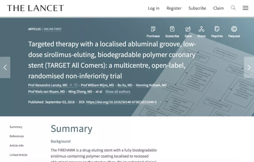 2018年9月,一項(xiàng)由10個(gè)國家和地區(qū)21家機(jī)構(gòu)聯(lián)合參與的一項(xiàng)大型臨床試驗(yàn)成果,首次刊登在《柳葉刀》上,這項(xiàng)試驗(yàn)證實(shí):中國自主研發(fā)的心臟冠脈藥物洗脫支架“火鷹”(FIREHAWK),使用了最少的藥劑量,因而獲得了最高的安全性,而同時(shí)在療效上與國際頂尖的XIENCE支架媲美。