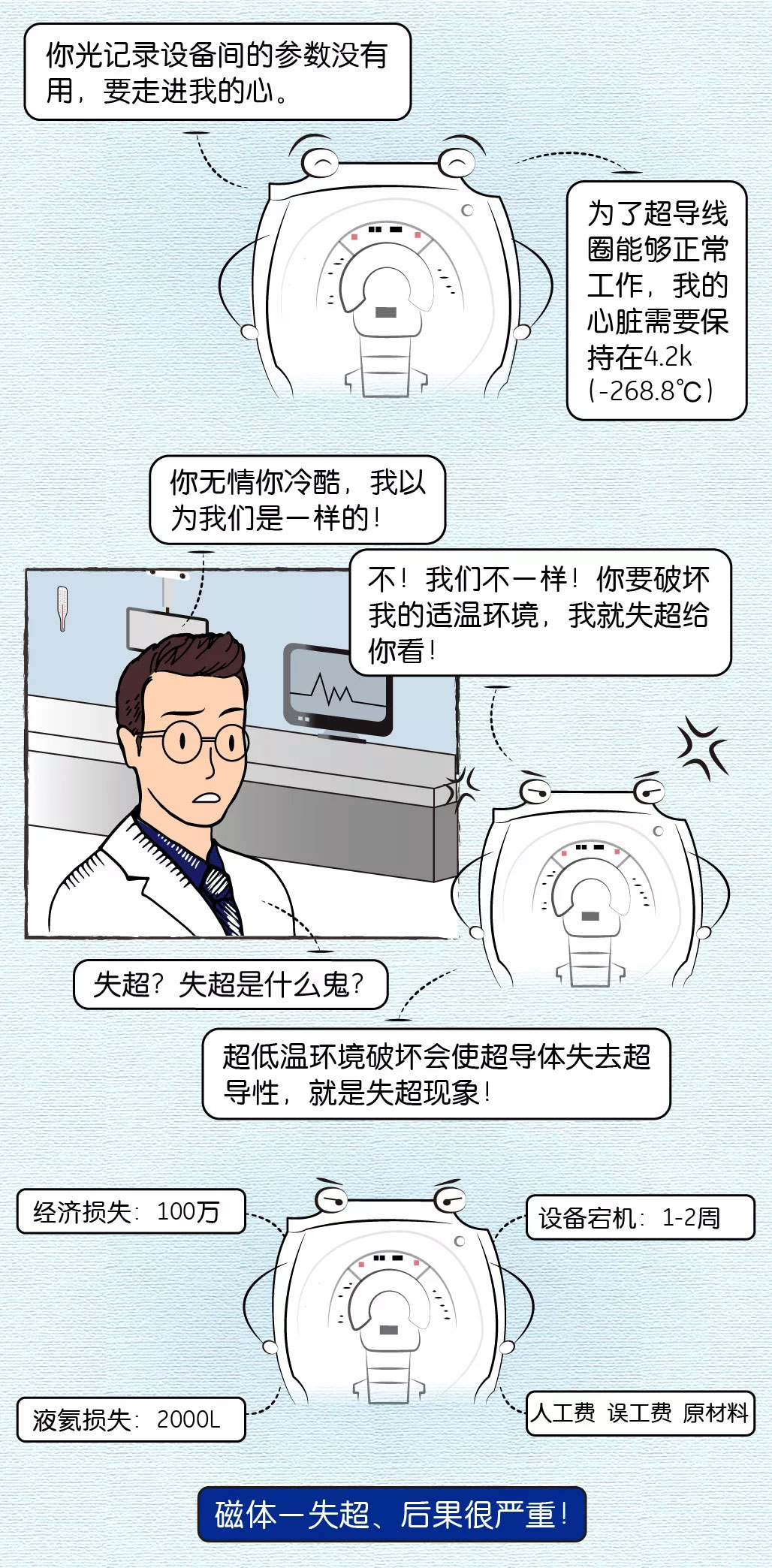 失超對(duì)于設(shè)備的運(yùn)營(yíng)方而言是近乎毀滅性的災(zāi)難,它意味著:直接經(jīng)濟(jì)損失100萬(wàn)、設(shè)備宕機(jī)1-2周、液氦損失2000L,外加上人工費(fèi)、誤工費(fèi)和材料費(fèi)等等。一句話,為免MRI發(fā)生失超,設(shè)備管理員須時(shí)刻提防、小心呵護(hù)。
