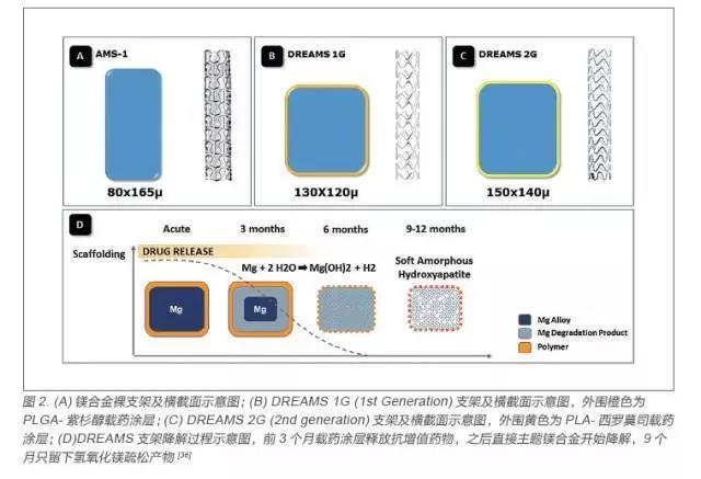 鎂是人體的必需元素,具有多種生理功能,與生命的維持、身體的健康有著極其密切的關(guān)系,因此可降解冠脈鎂合金支架研發(fā)處于可降解金屬支架的領(lǐng)先水平,以德國Biotronik 公司的鎂合金支架為代表, 前后經(jīng)歷了AMS、DREAMS 1G(drug-eluting absorbable metal scaffold 1 generation)和DREAMS 2G(drug-eluting absorbable metalscaffold 2 generation)三代支架(圖2),支架基體采用WE43 鎂合金材料[21]。AMS 為鎂合金裸支架,經(jīng)過PROGRESS 臨床實(shí)驗(yàn)顯示支架具有良好的安全性,且在新生兒體內(nèi)植入兩個(gè)AMS支架后,新生兒血清鎂含量處于正常水平,且不需要進(jìn)行二次手術(shù),但是降解速度太快徑向支撐力不足導(dǎo)致晚期管腔丟失現(xiàn)象嚴(yán)重,因此在該基礎(chǔ)上對(duì)鎂合金裸支架的成分和構(gòu)型進(jìn)行了更新,加粗了骨架尺寸,添加了一層載有紫杉醇藥物的可降解PLGA 高分子涂層,從而增強(qiáng)了支架支撐力,減少內(nèi)膜增生以及降低降解速率,研發(fā)出了DREAMS 1G[22-24]。