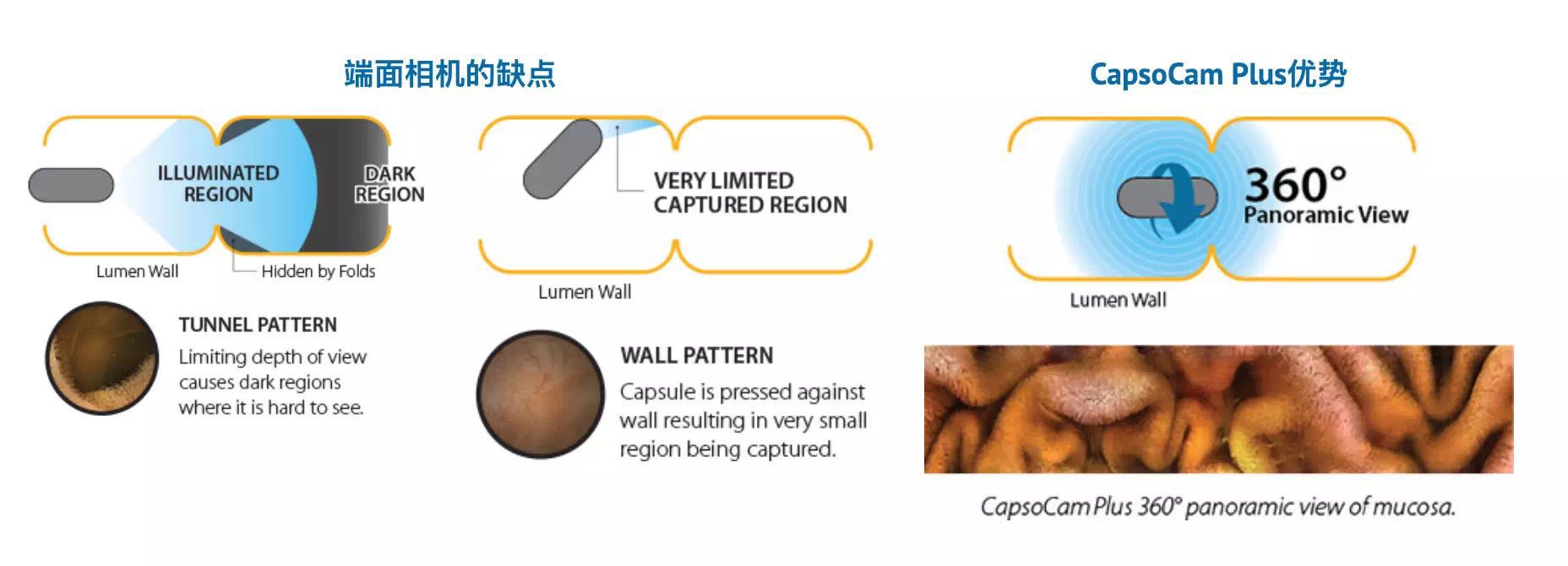 CapsoCam Plus旨在通過提供小腸粘膜的360o全景側(cè)視圖來提高診斷信心。更精細的成像和更大的垂直視野允許比前幾代CapsoCam更好的組織表征。